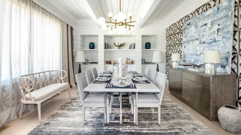 The room, which has the couple’s trademark blue color palette, also features pieces from their furniture collection for home furnishings company, Kravet, including upholstered dining chairs and a bar. They also added some books to a built-in that the builder intended to use as a bar.